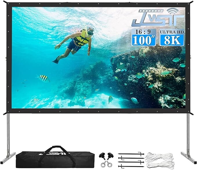 16:9 widescreen aspect ratio screen that easily clips onto frame. Frame assembles in minutes and is easily moved by one person.